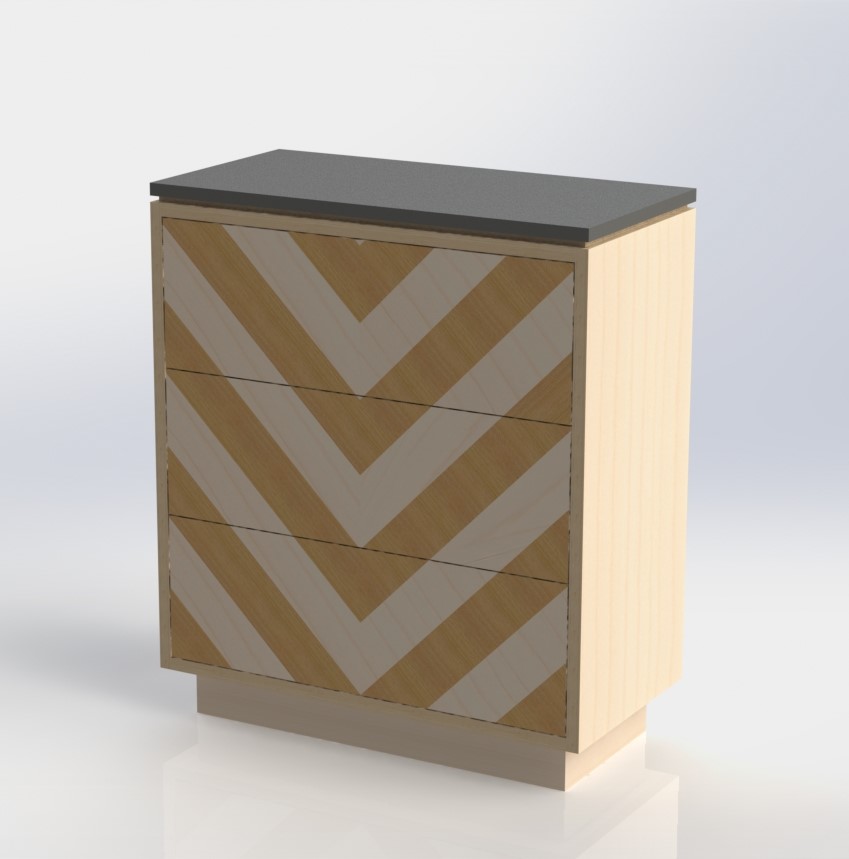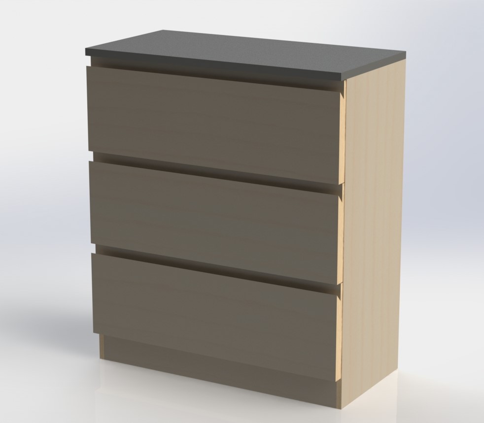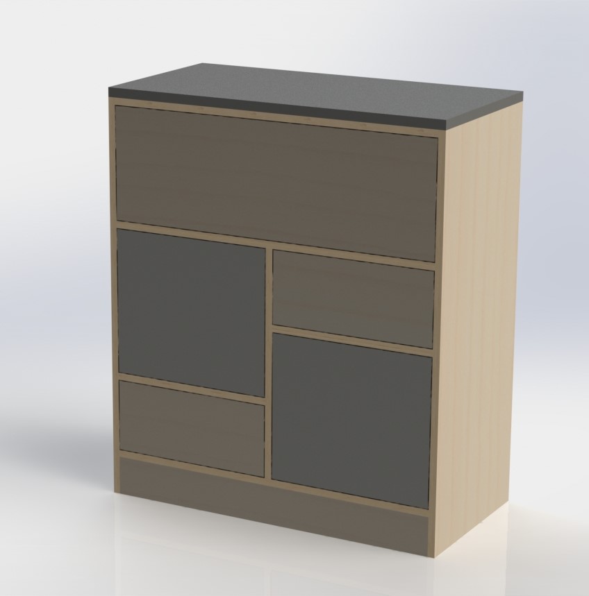 it was made using grey melamine faced board, with stone effect laminate for the worktop, with clear toughened glass in the middle to be able to see into the top of the draws