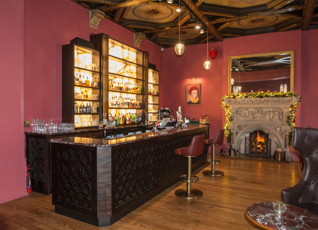 Illuminated Italian Marble back bar with matched pattern, LED Light-boxes behind.